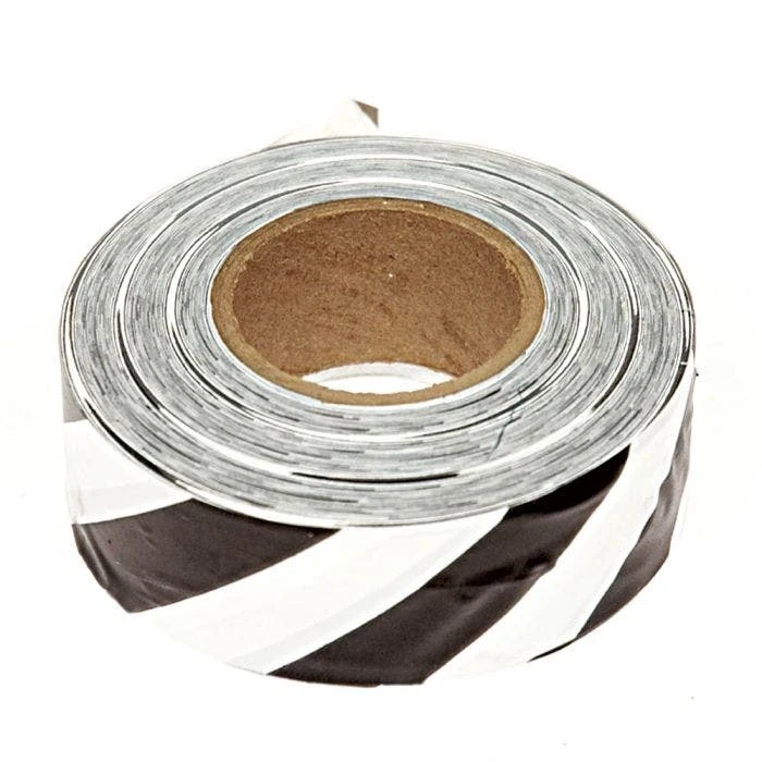This Striped Flagging Tape features a durable plastic construction. Each roll of non-adhesive tape measures 1-3/16 inches in width and 300 feet in length. This box contains 12 rolls of black/white-striped tape.