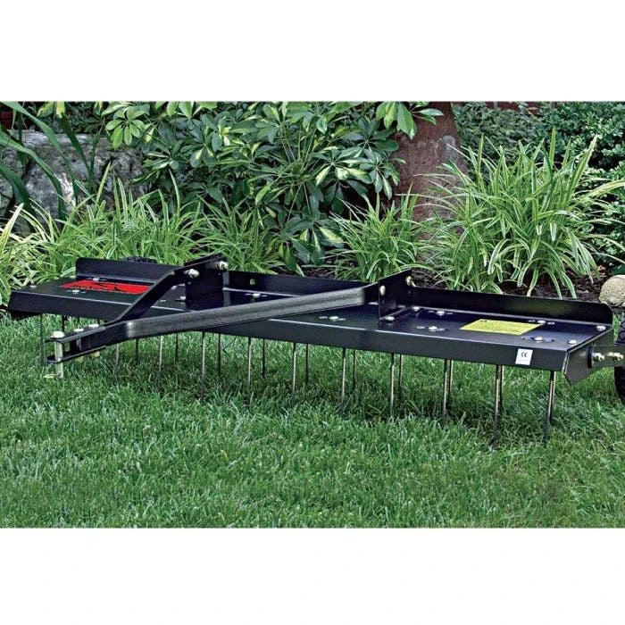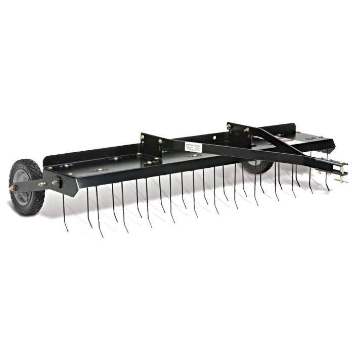 A heavy-duty steel tray holds up to 200 pounds for additional support. A universal trailer hitch fits all riding lawn/garden tractors and ZTR mowers with a rear hitch plate. Thatch buildup prevents water, air, and nutrients from reaching your lawn’s root system. The Brinly Tow-Behind Dethatcher gently combs away this debris to the surface, allowing vital elements to pass through.