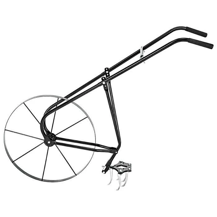 The tool weighs 19 pounds and features a tubular steel frame and handle. The steel wheel has a diameter of 24 inches.