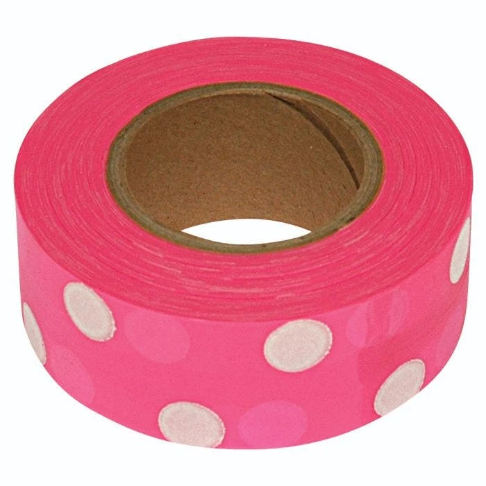 This Polka Dot Flagging Tape features a durable plastic construction. Each roll of non-adhesive tape measures 1-3/16 inches in width and 300 feet in length. This box contains 12 rolls of white/glo pink polka dot tape.