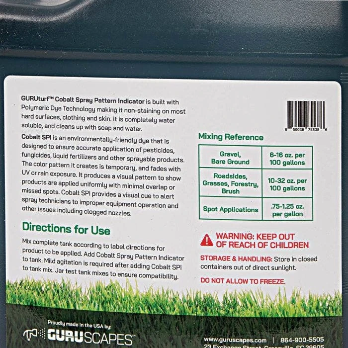 Finally, an environmentally friendly, non-staining dye designed to ensure accurate spray application! Ideal for visually tracking spray patterns to show products are applied uniformly, with minimal waste or overlap. Easily added to virtually any tank mix. Ideal for accurate applications of pesticides, fungicides, liquid fertilizers and other sprayable products. Built with one of a kind polymeric dye technology, the unique color pattern is non-staining on most surfaces. After application the temporary dye fades with normal UV and rain exposure. Cobalt SPI is completely water soluble, and easily cleans up with just soap and water. It also helps spray technicians quickly identify improper equipment operation such as clogged nozzles.