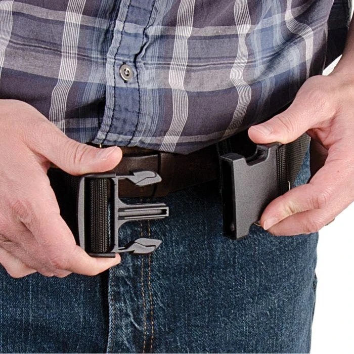 Metal clip on the holster back to attach to clothing or your belt, or slip your belt through the wide belt slots.