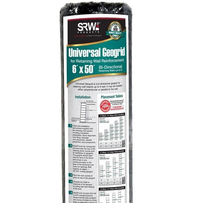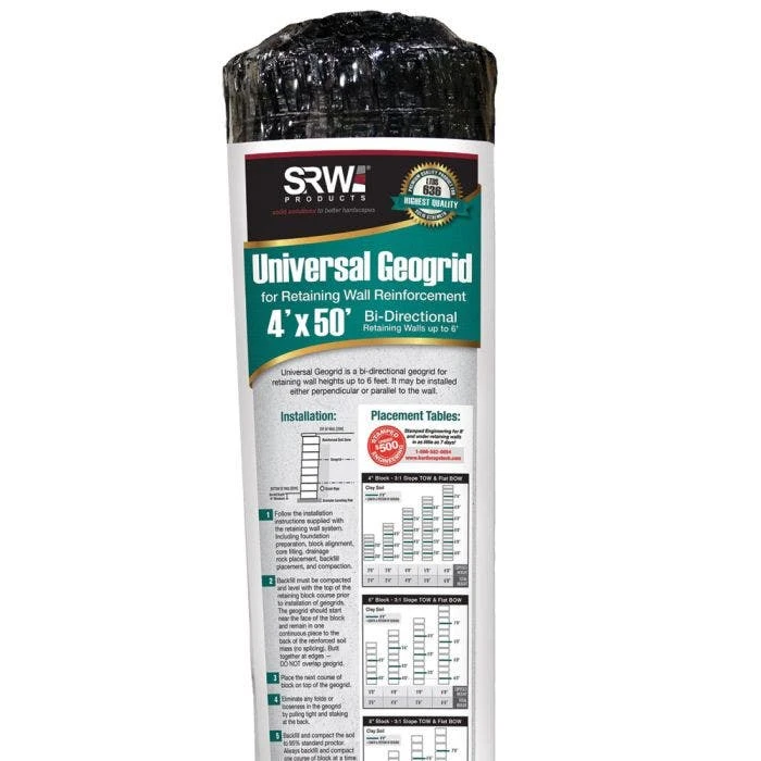 SRW makes its geogrids with a high-end, multi-filament polyester yarn. They then weave this high-tenacity yarn into a stable network, place it under tension, and then coat it with PVC. Use the universal series geogrids for retaining walls of up to 6 feet in height. Choose the 3-series for retaining walls of up to 10 feet in height.