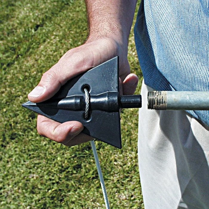 - Arrow anchors are easily driven into the ground with a standard 4′ length 1/2″ steel pipe.
